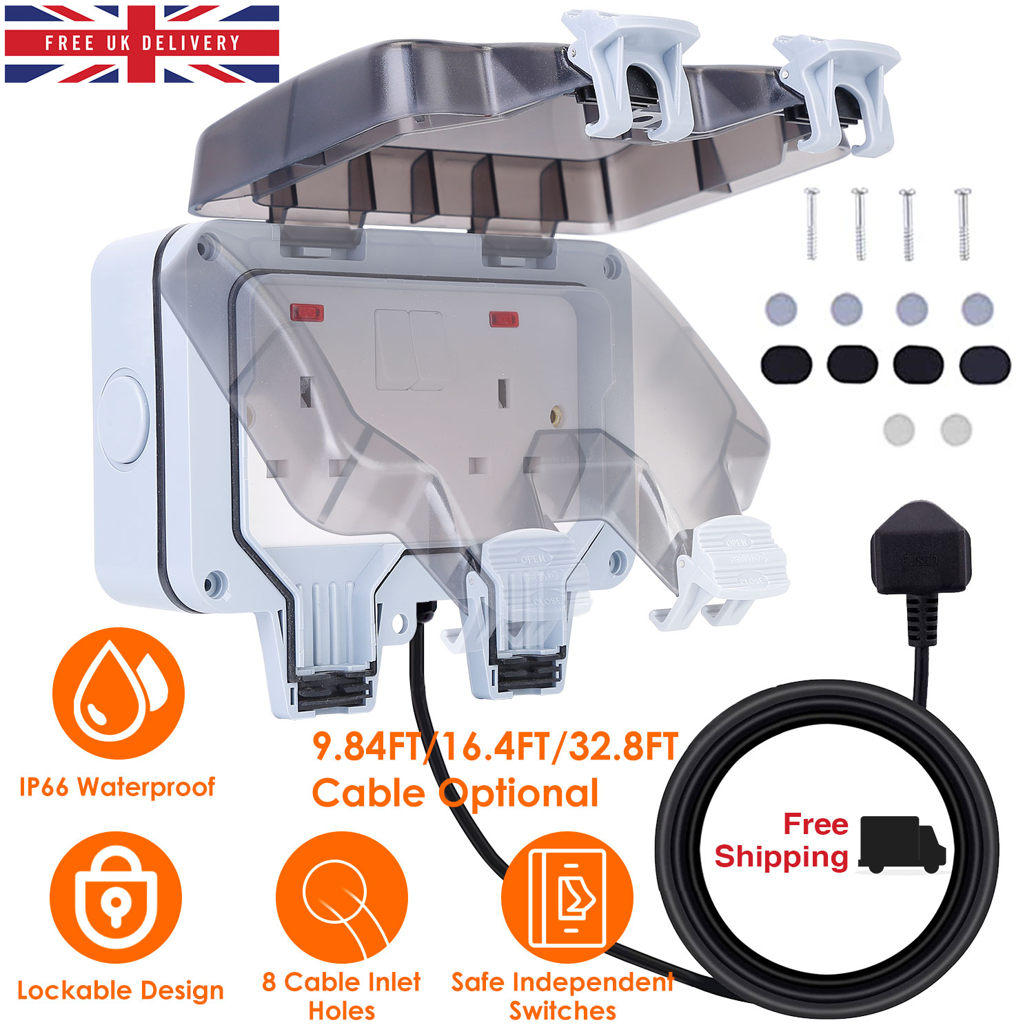 Home > Double Outdoor Socket IP66 Waterproof 13A 2 Gang UK Plug Twin Switched Double Socket Electrical Wall Outlet Socket Box w/ 9.84ft Extension Cable